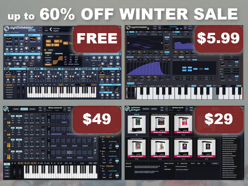 We are kicking off our Winter Sale with huge discounts on all of our products. Get SynthMaster One for FREE, SynthMaster 3 Player for $29, SynthMaster 3 for $49 or our Everything Bundle with 2 synths + 8000+ presets for $129